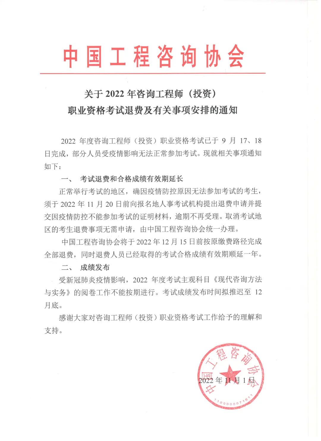 中國工程咨詢協(xié)會(huì)關(guān)于2022年咨詢工程師(投資)職業(yè)資格考試退費(fèi)及有關(guān)事項(xiàng)安排的通知