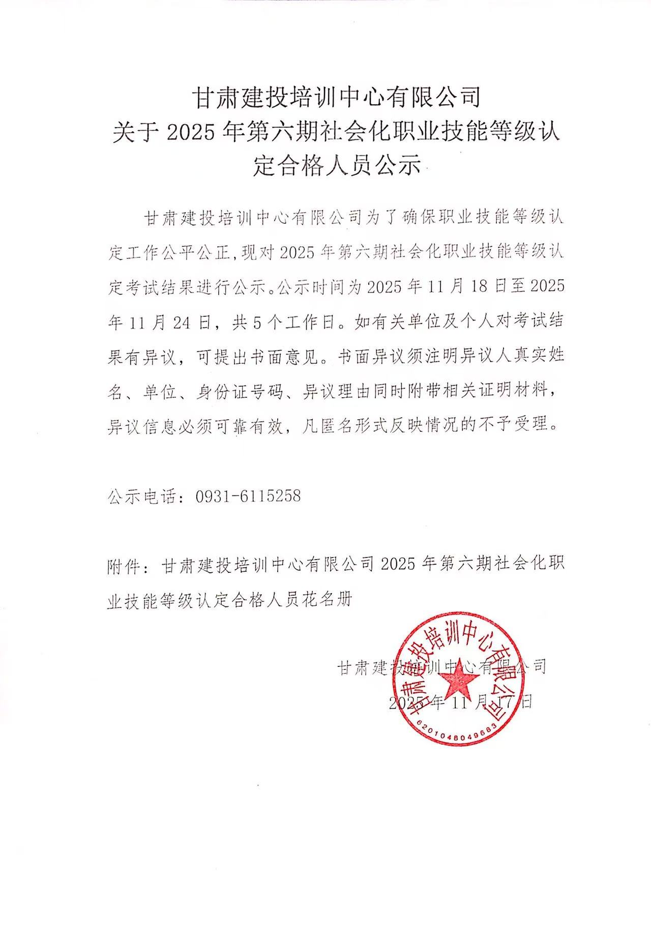 甘肅建投培訓(xùn)中心有限公司關(guān)于2025年第六期社會(huì)化職業(yè)技能等級(jí)認(rèn)定合格人員公示